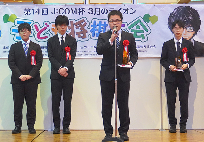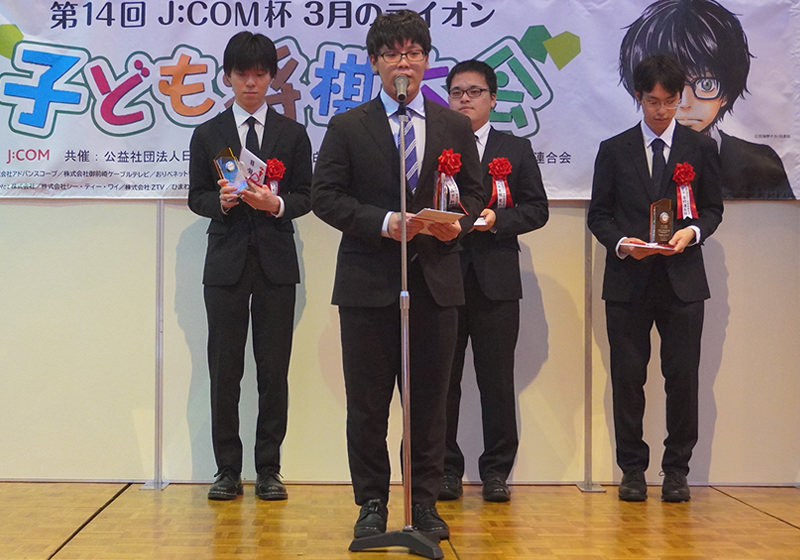 棋士を目指されるお子さんには厳しい道のりが待っているかと思いますが、今日のJ:COM杯など、大会での楽しかった思い出を忘れずに、また奨励会に入った時もその気持ちを忘れずにいてほしいです。そして棋士を目指されない方も、将棋を通し、大人になった時に思い返せるような楽しい思い出をつくってほしいと思います。